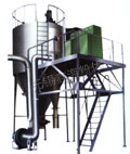 空氣經(jīng)過(guò)濾和加熱,進(jìn)入干燥器頂部空氣分配器,熱空氣呈螺旋狀均勻地進(jìn)入干燥室。料液經(jīng)塔體頂部的高速離心霧化器,(旋轉(zhuǎn))噴霧成細(xì)微的霧狀液珠,與熱空氣并流接觸在短的時(shí)間內(nèi)可干燥為成品。成品連續(xù)地由干燥塔底部和旋風(fēng)分離器中輸出,廢氣由風(fēng)機(jī)排空。